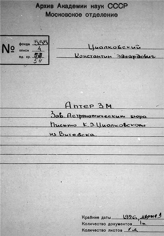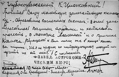Письмо зав. астрономическим бюро Аптер Зинаиды Марковны к К.Э. Циолковскому.