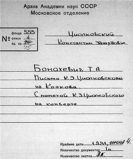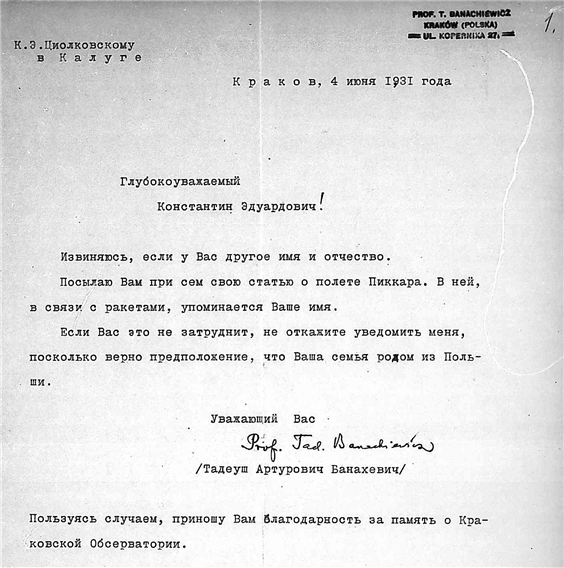Письмо профессора Банахевича Тадеуша Артуровича к К.Э. Циолковскому.