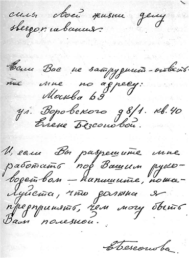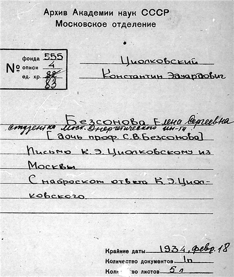 Дело № 83 | Название: | Письмо студентки Энергетического института (3-й курс) Безсоновой Елены Сергеевны (дочь проф. С.В. Безсонова) к К.Э. Циолковскому. | | Вид материала: | письмо | | Способ воспроизведения: | автограф | | Языки: | русский | | Крайние даты: | 18.02.1934 | | Изображения страниц: |
