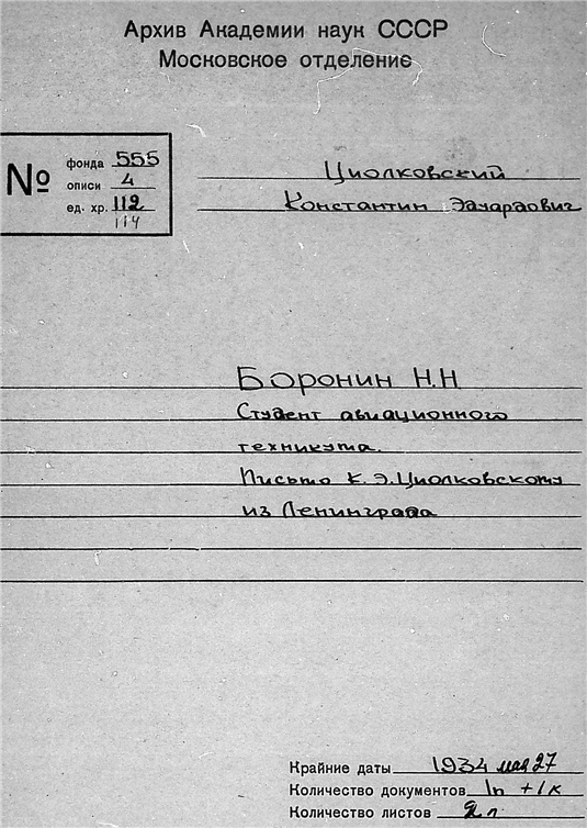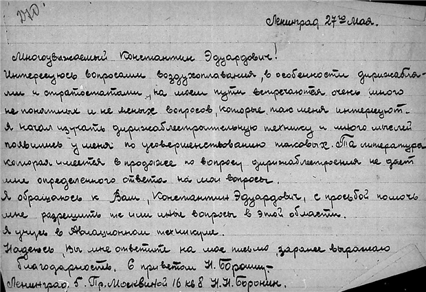 Письмо студента авиационного техникума Н.Н. Боронина к К.Э. Циолковскому.