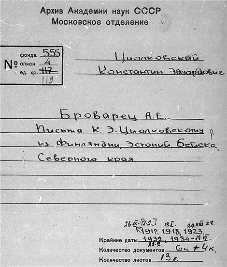 Письма [агронома, милиоратора] Бровареца Алексея Евдокимовича к К.Э. Циолковскому.
