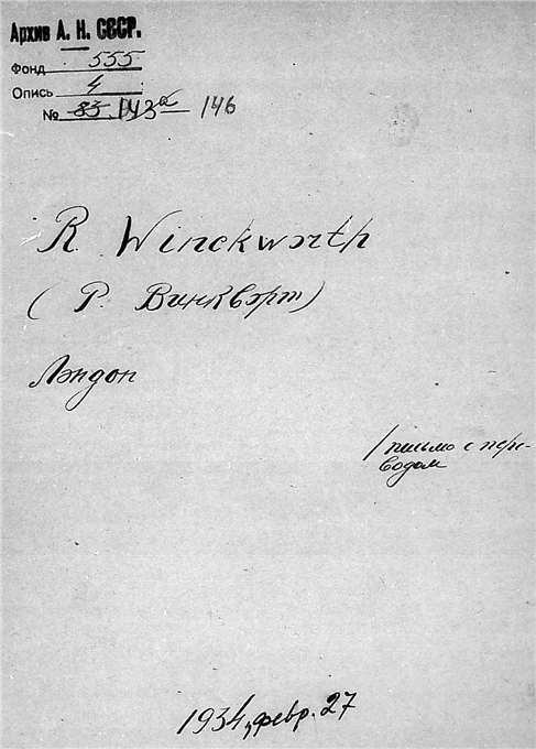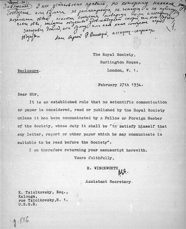 Письмо ассистента секретаря Королевского общества Р. Винкворта (Winckworth R) к К.Э. Циолковскому.