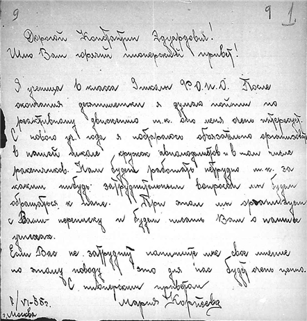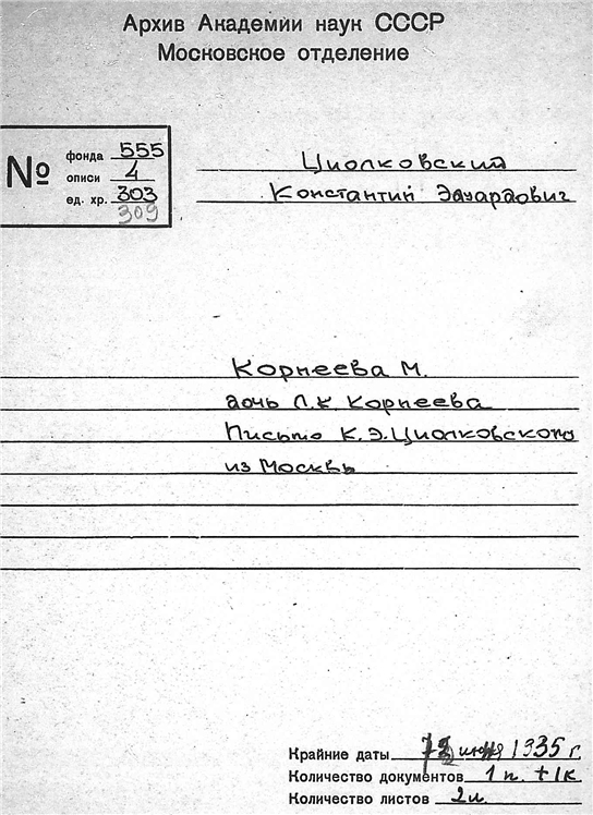 Письмо дочери Л.К. Корнеева Корнеевой М. к К.Э. Циолковскому.