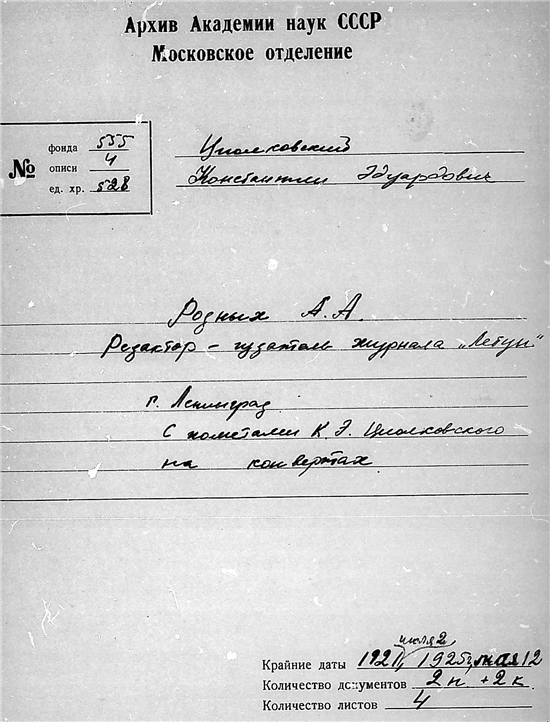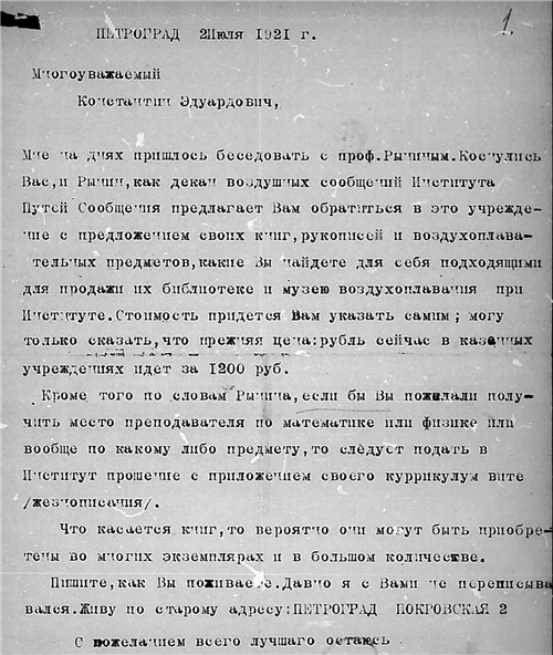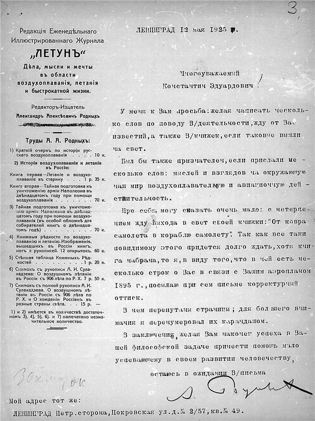 Письма редактора-издателя журнала "Летун" Родных Александра Алексеевича к К.Э. Циолковскому.