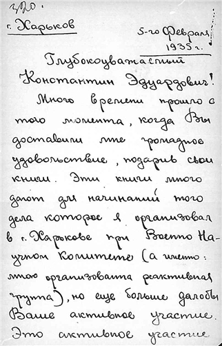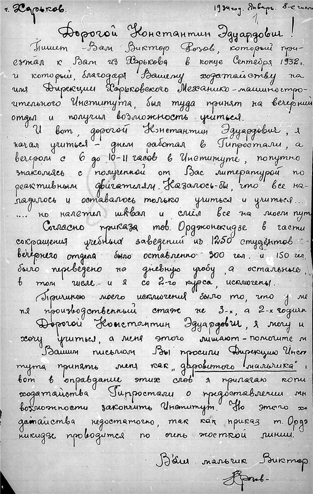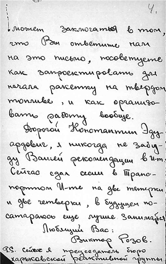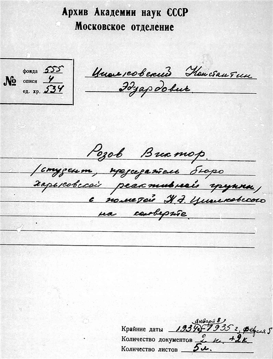 Дело № 534 | Название: | Письма студента, председателя бюро Харьковской реактивной группы военно-научного комитета Виктора Розова к К.Э. Циолковскому. | | Вид материала: | письма | | Способ воспроизведения: | автограф | | Языки: | русский | | Крайние даты: | 8.01.1934 - 5.02.1935 | | Изображения страниц: |