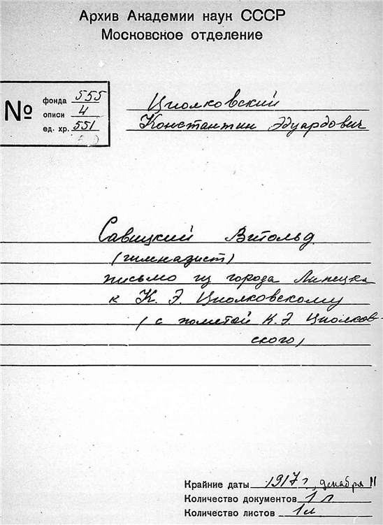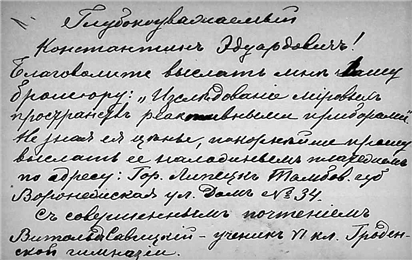 Письмо гимназиста Витольда Савицкого к К.Э. Циолковскому.
