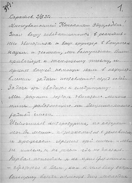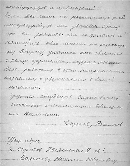 Письмо представителя группы студентов Сазонова Николая Ивановича к К.Э. Циолковскому.