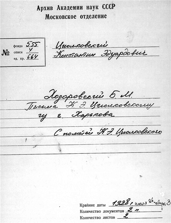 Письма Б.М. Ходоровского к К.Э. Циолковскому.