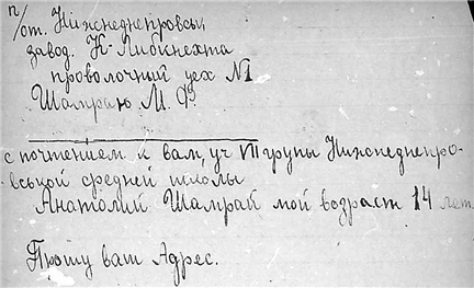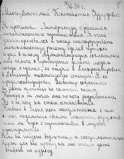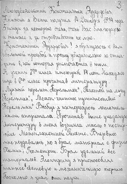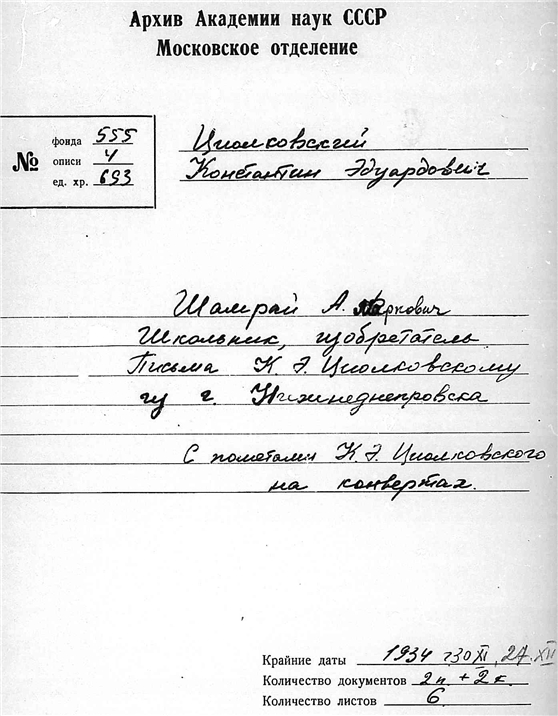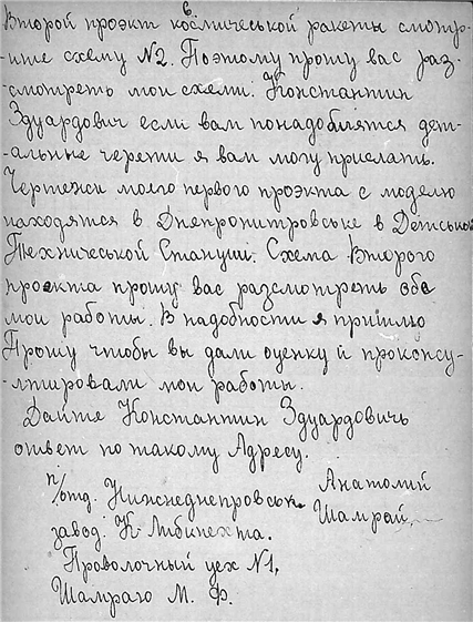 Письма школьника, изобретателя Анатолия Марковича Шамрая к К.Э. Циолковскому.
