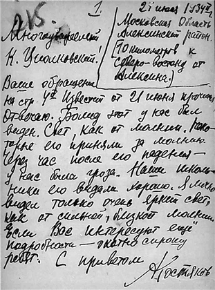 Письмо А.М. Костякова к К.Э. Циолковскому в ответ на его заметку "Кто видел Болид?».