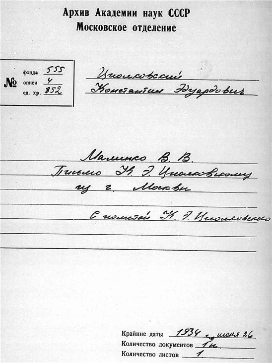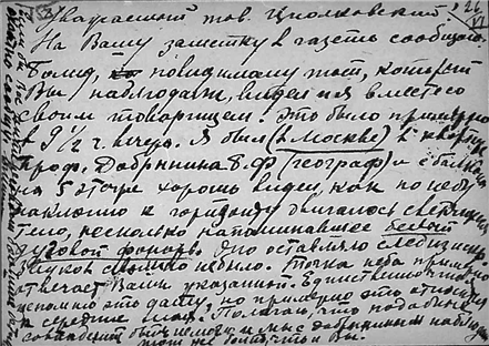 Письмо Вячеслава Владимировича Малинко к К.Э. Циолковскому в ответ на его заметку "Кто видел Болид?».