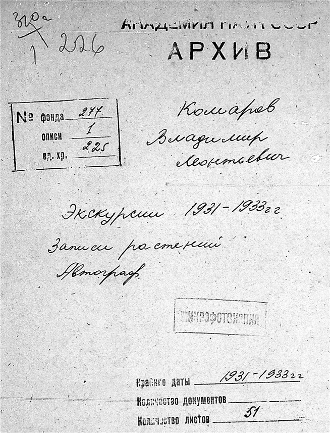 Комаров Владимир Леонтьевич. Экскурсии 1931 - 1933.