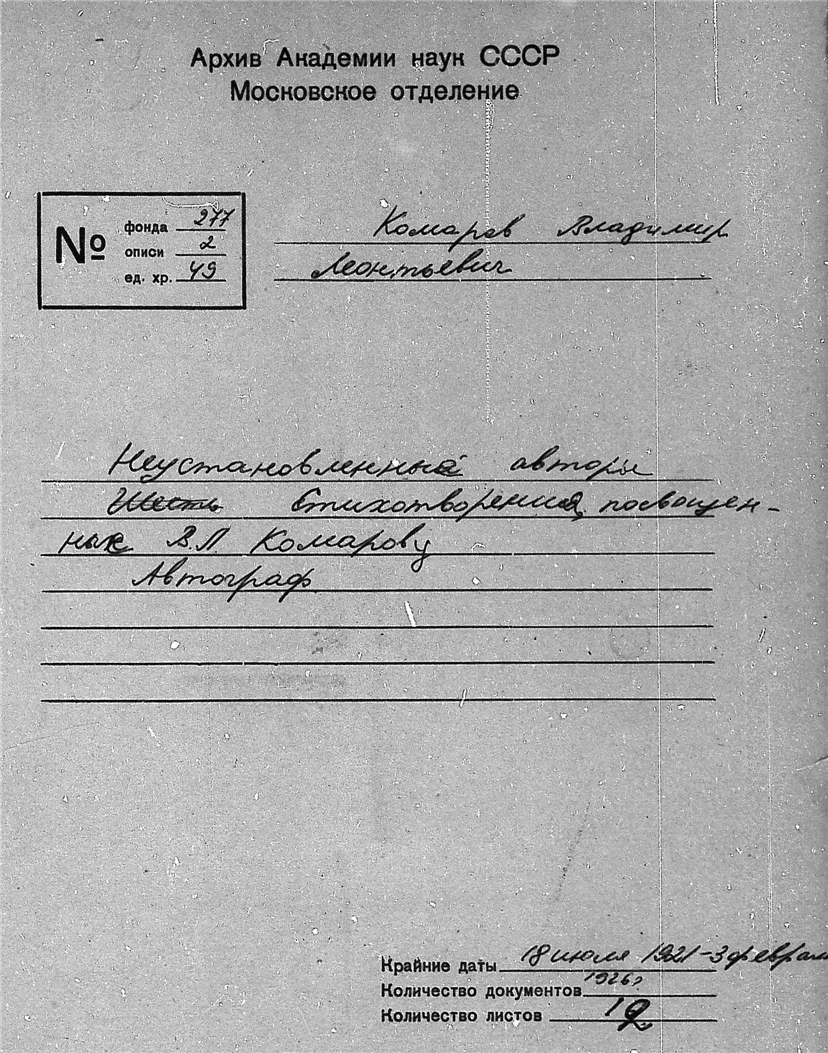 Комаров Владимир Леонтьевич. Неустановленные авторы. Стихотворения, посвященные В. Л. Комарову.
