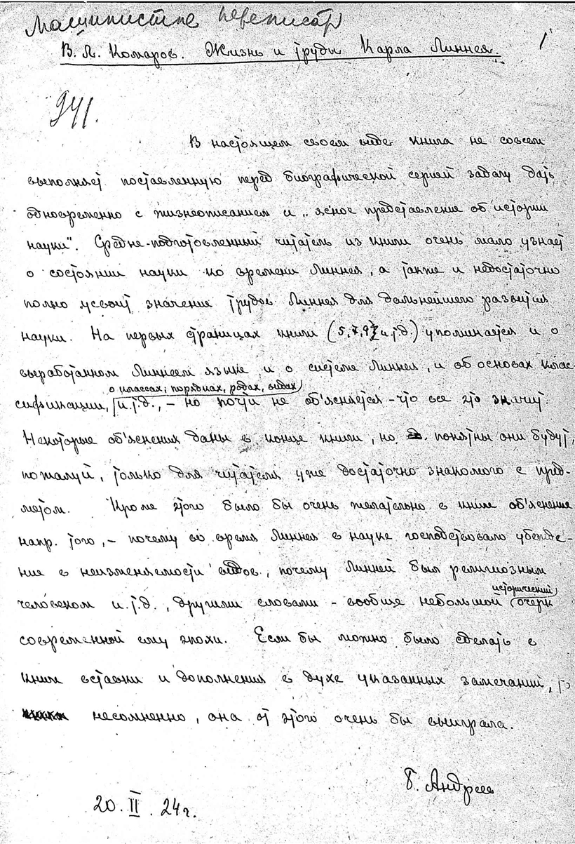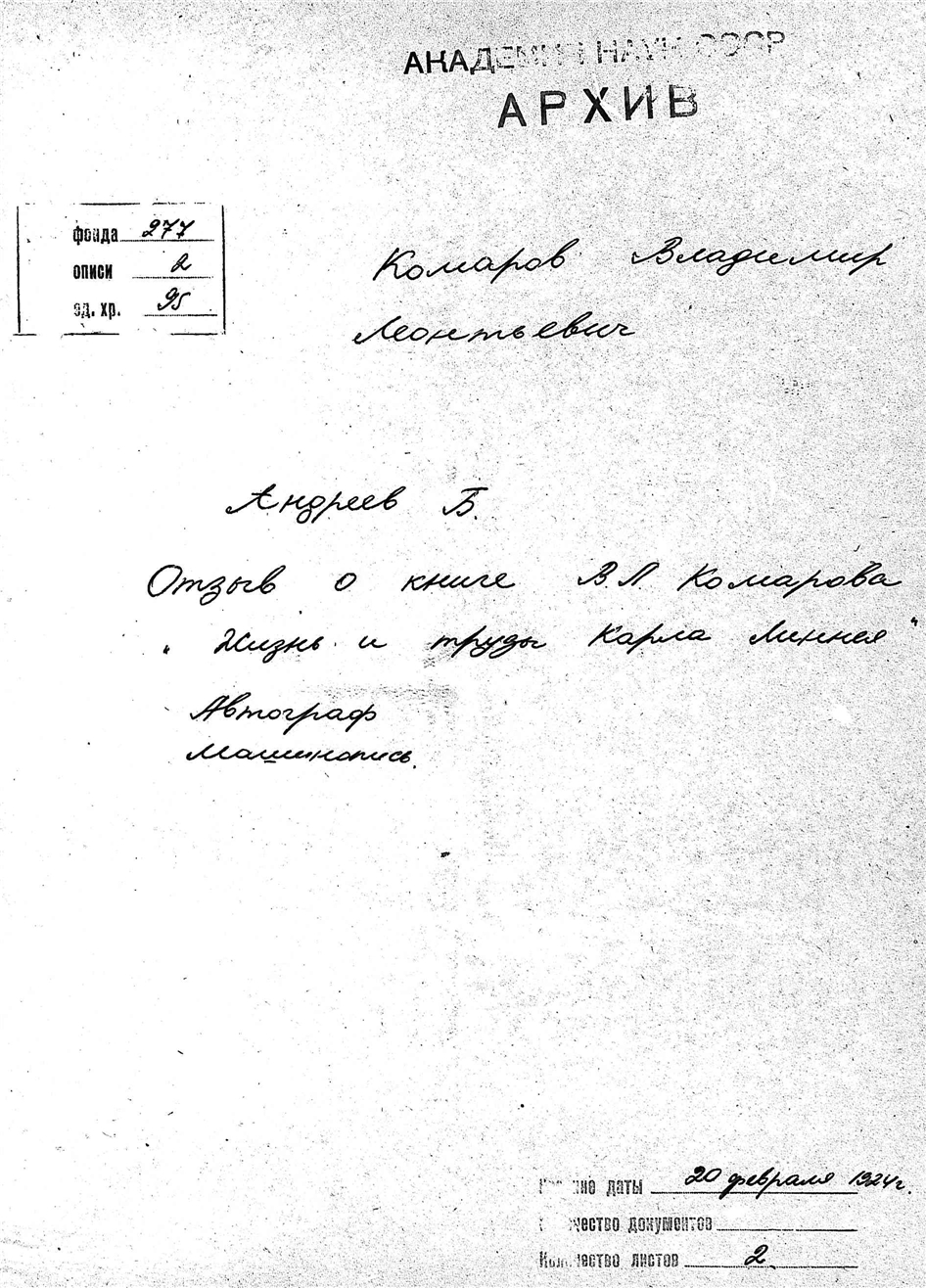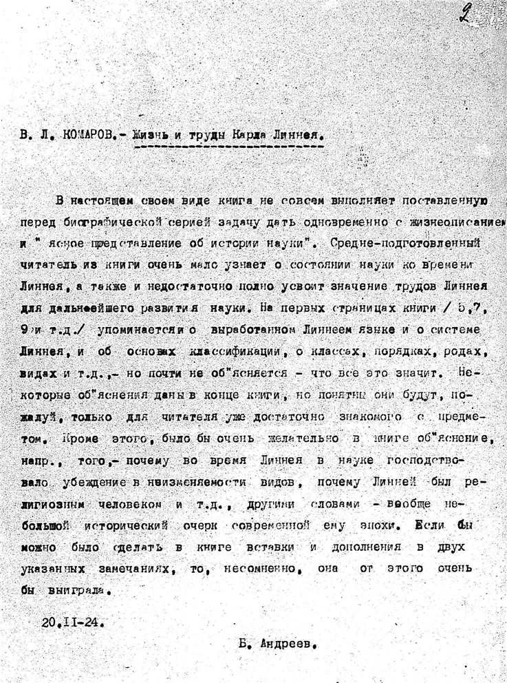Комаров Владимир Леонтьевич. Б. Андреев. Отзыв о книге В. Л. Комарова "Жизнь и труды Карла Линнея".