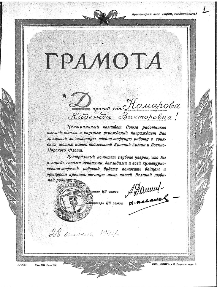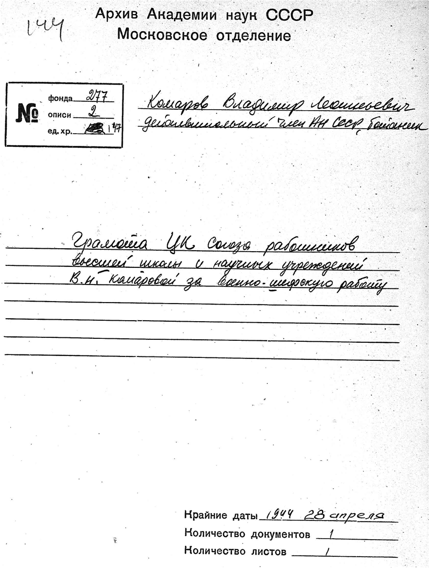 Дело № 147 | Название: | Комаров Владимир Леонтьевич. Грамота ЦК Союза работников высшей школы и научных учреждений Н. В. Комаровой за военно-шефскую работу. | | Вид материала: | грамота | | Способ воспроизведения: | типографский бланк | | Языки: | русский | | Крайние даты: | | | Изображения страниц: |