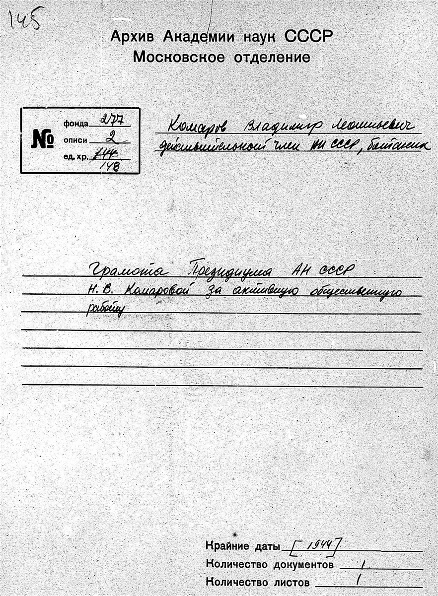 Комаров Владимир Леонтьевич. Грамота Президиума АН СССР Н. В. Комаровой за активную общественную работу.