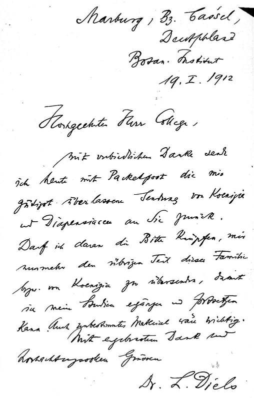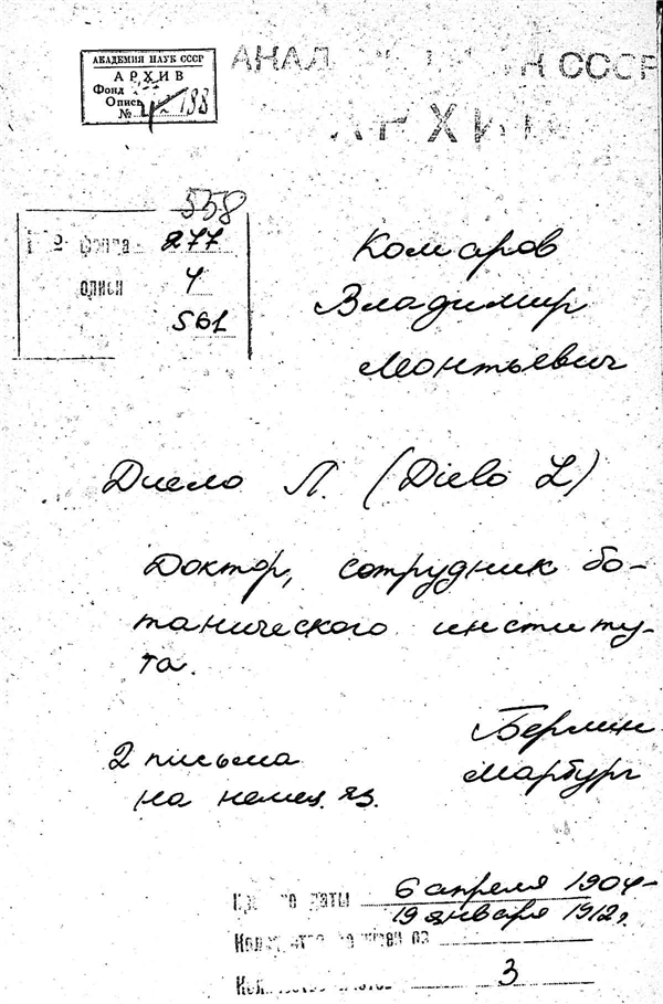 Комаров Владимир Леонтьевич. Л. Диело (L. Dielo), доктор, сотрудник ботанического института. Берлин, Марбург.