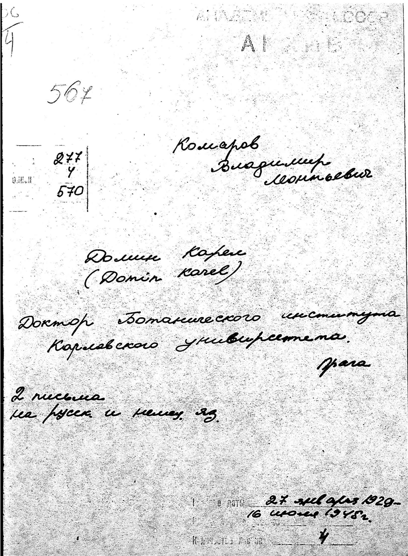 Дело № 570 | Название: | Комаров Владимир Леонтьевич. Домин Карел (Domin Karel), доктор Ботанического института Карловского университета. Прага. | | Вид материала: | письма | | Способ воспроизведения: | авторизованная машинопись | | Языки: | русский, немецкий | | Крайние даты: | | | Изображения страниц: |