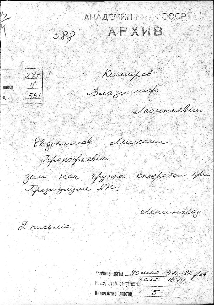 Комаров Владимир Леонтьевич. Евдокимов Михаил Прокофиевич, зам нач. группы спецработ при Президиуме АН. Ленинград.