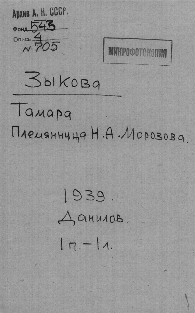 Зыкова Тамара. Племянница Н. А. Морозова. Данилов.