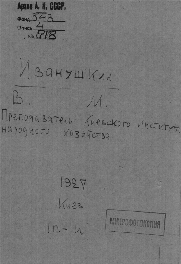 Иванушкин В. М. Преподаватель Киевского института народного хозяйства. Киев.