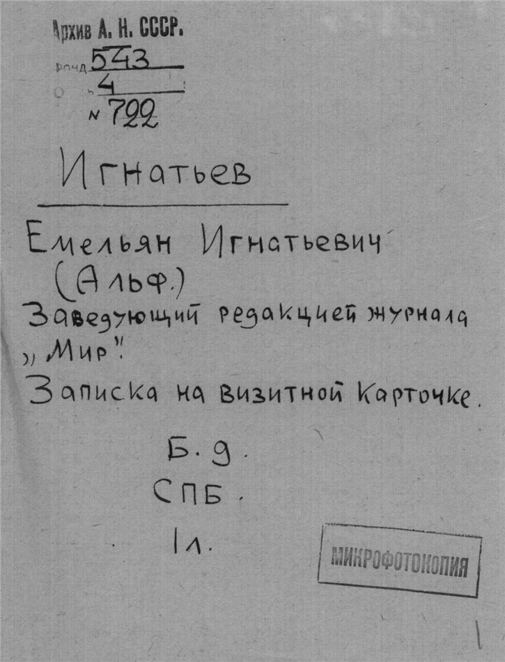 Игнатьев Емельян Игнатьевич (Альф). Заведующий редакцией журнала «Мир». СПБ.