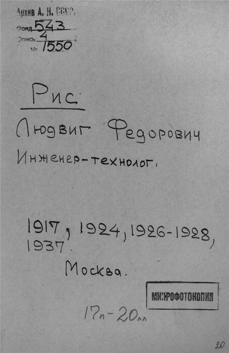 Рис Людвиг Фёдорович. Инженер-технолог. Москва.