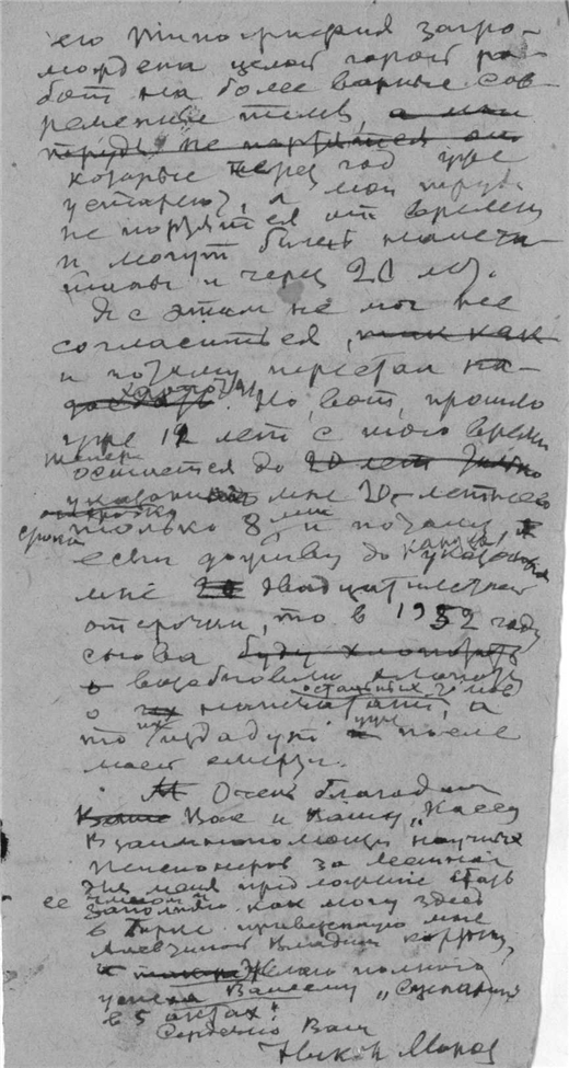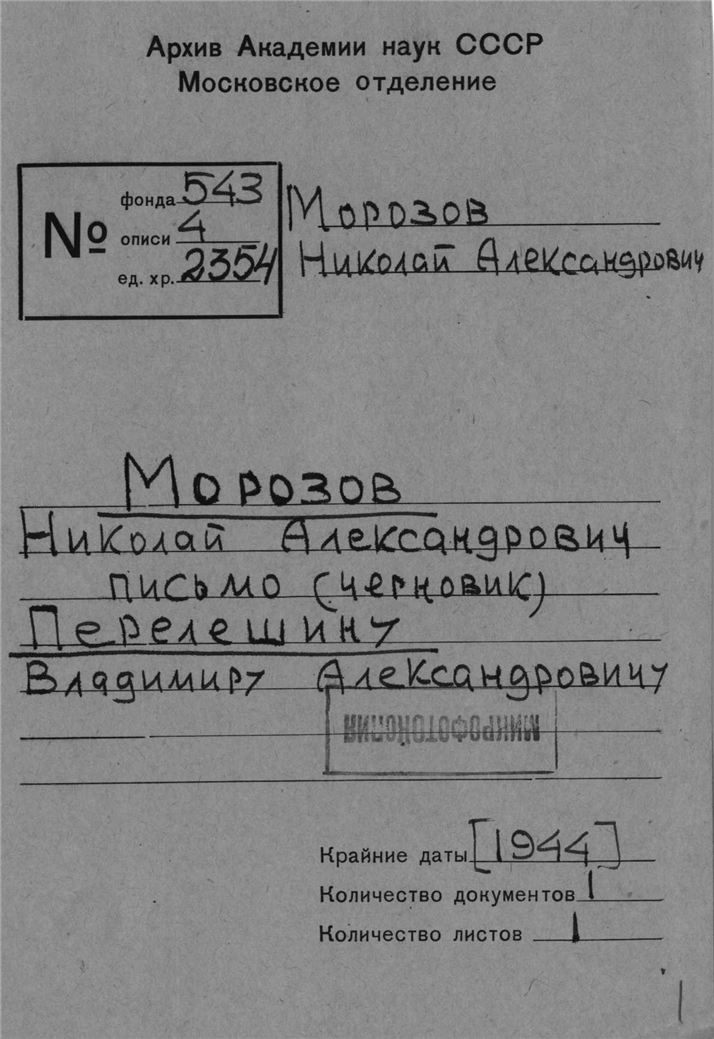 Морозов Н. А. Письмо (черновик) Перелешину Владимиру Александровичу.