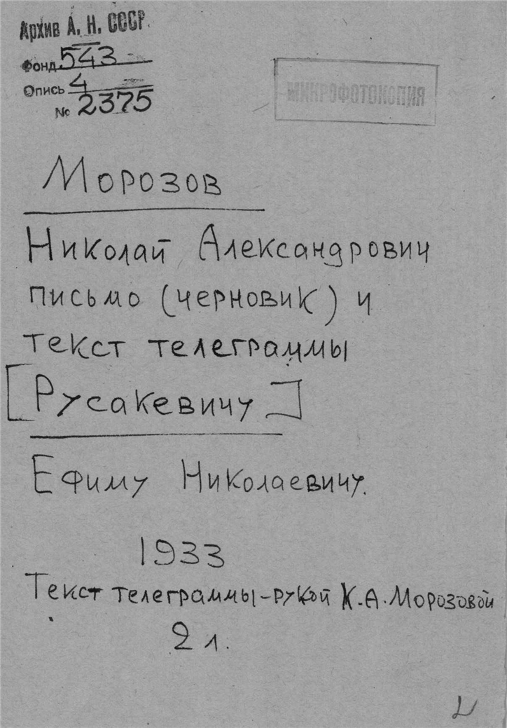 Морозов Н. А. Письмо (черновик) и текст телеграммы Русакевичу Ефиму Николаевичу.