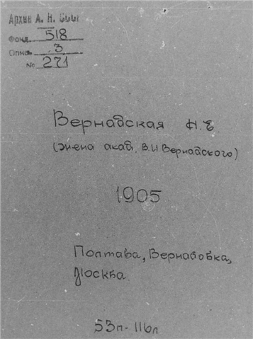 Вернадская Н. Е. (жена акад. В. И. Вернадского). Полтава, Москва, Вернандовка.