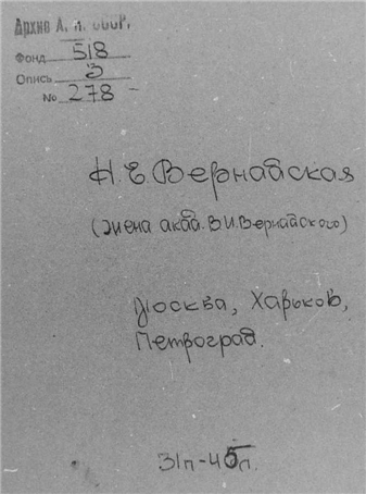 Н. Е. Вернадская (жена акад. В. И. Вернадского). Москва, Харьков, Петроград.
