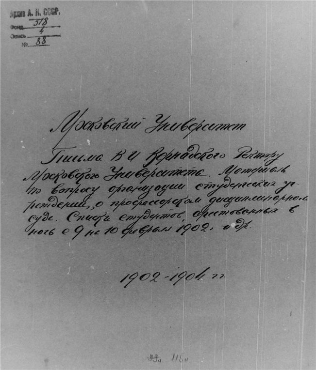 Дело № 88 | Название: | Московский университет. Письма В. И. Вернадского ректору, материалы по разным вопросам, списки студентов и др. | | Вид материала: | материалы, списки | | Способ воспроизведения: | автограф | | Языки: | русский | | Крайние даты: | 1902, 1904 | | Изображения страниц: |